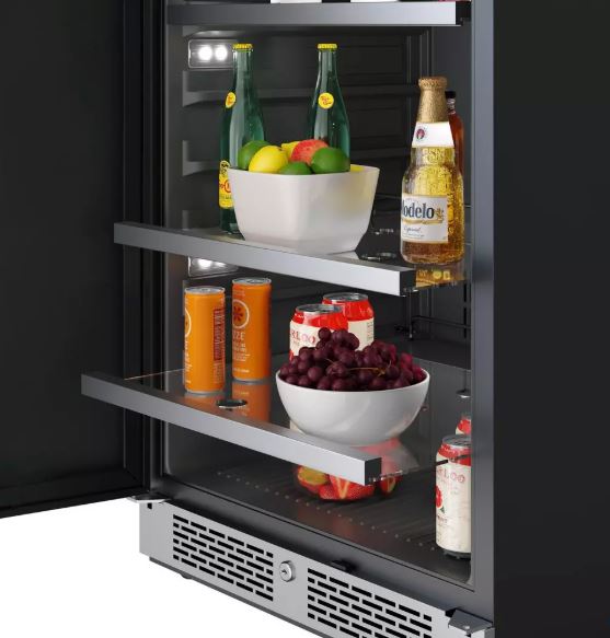 - Five roll-out wood shelves with stainless steel trim