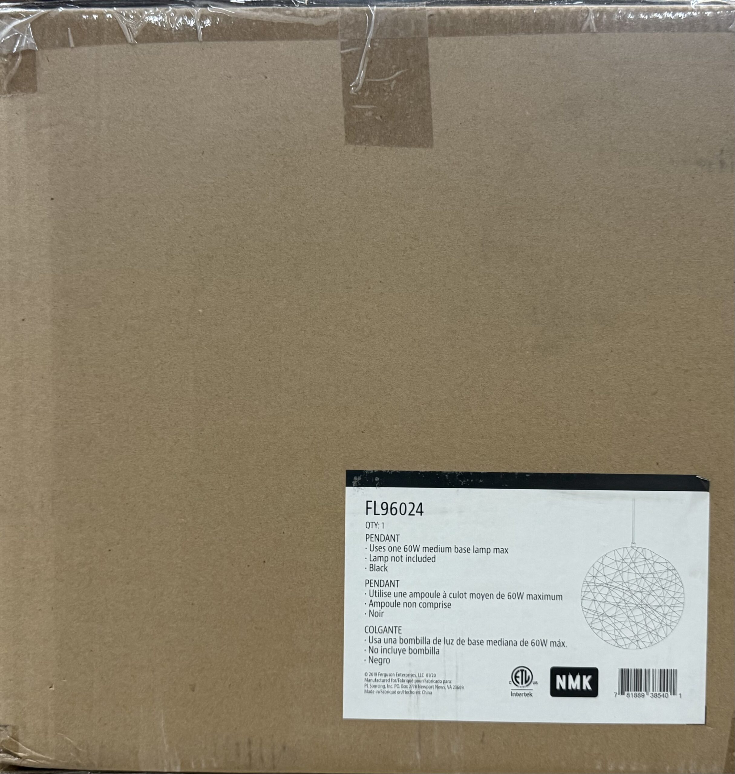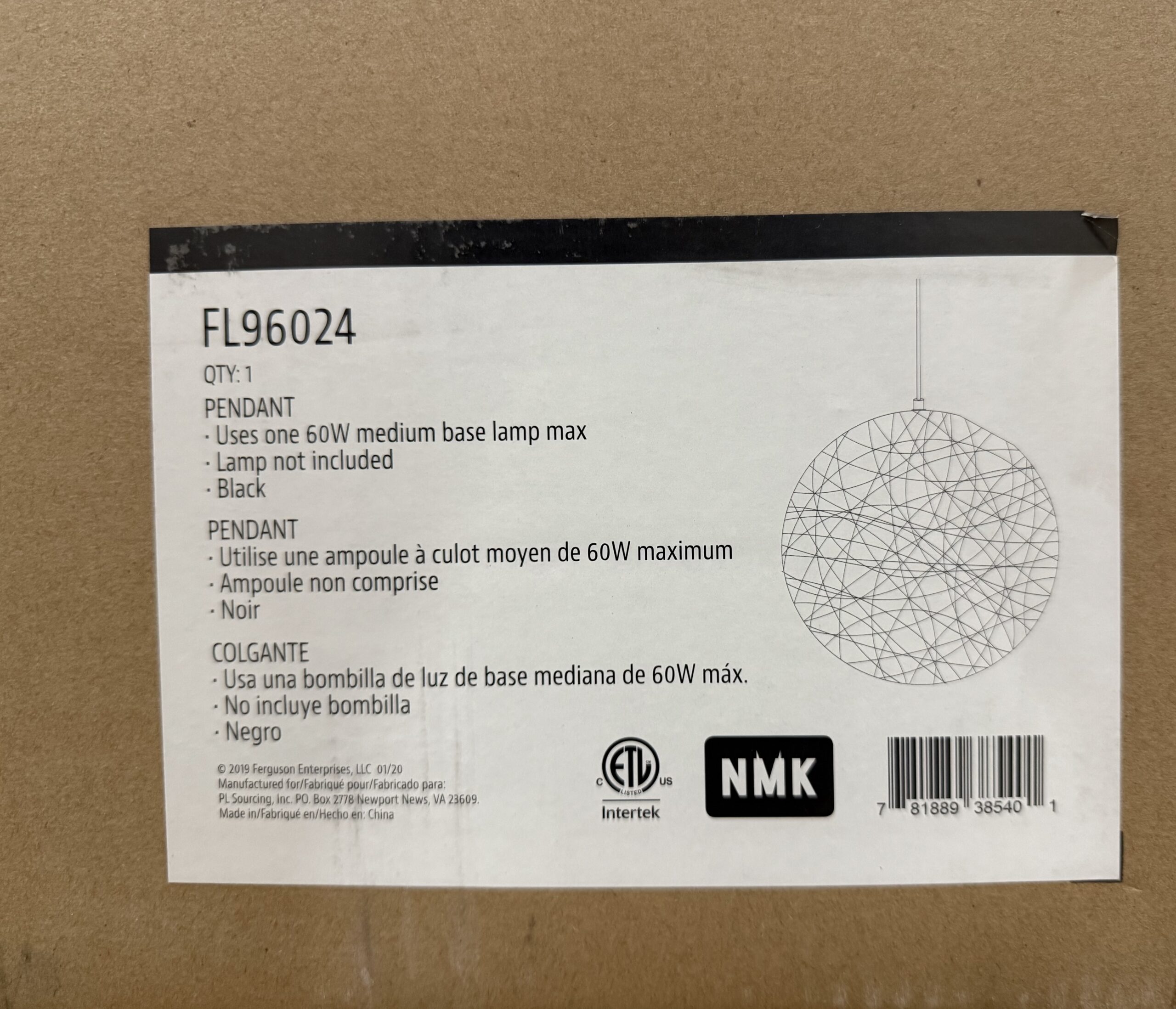60W Medium Pendant Light FL96024 *0225 RAT 1 60W MED PEND