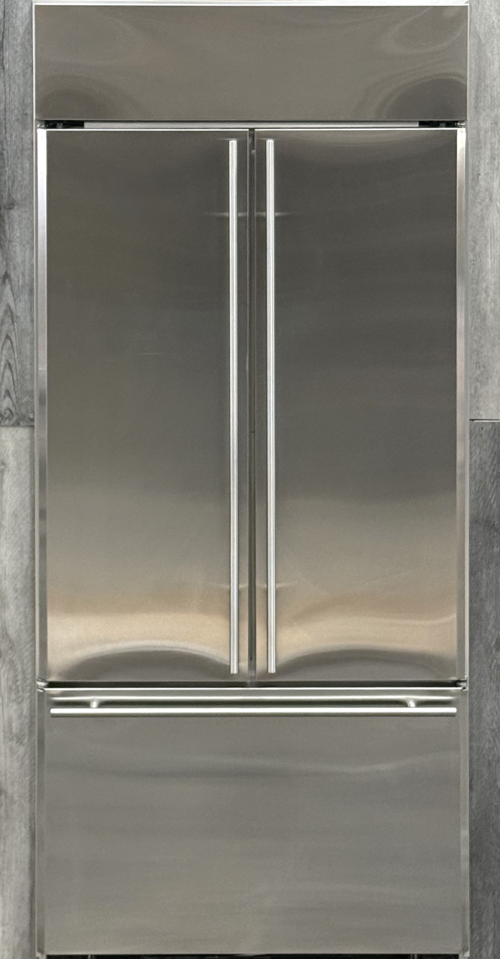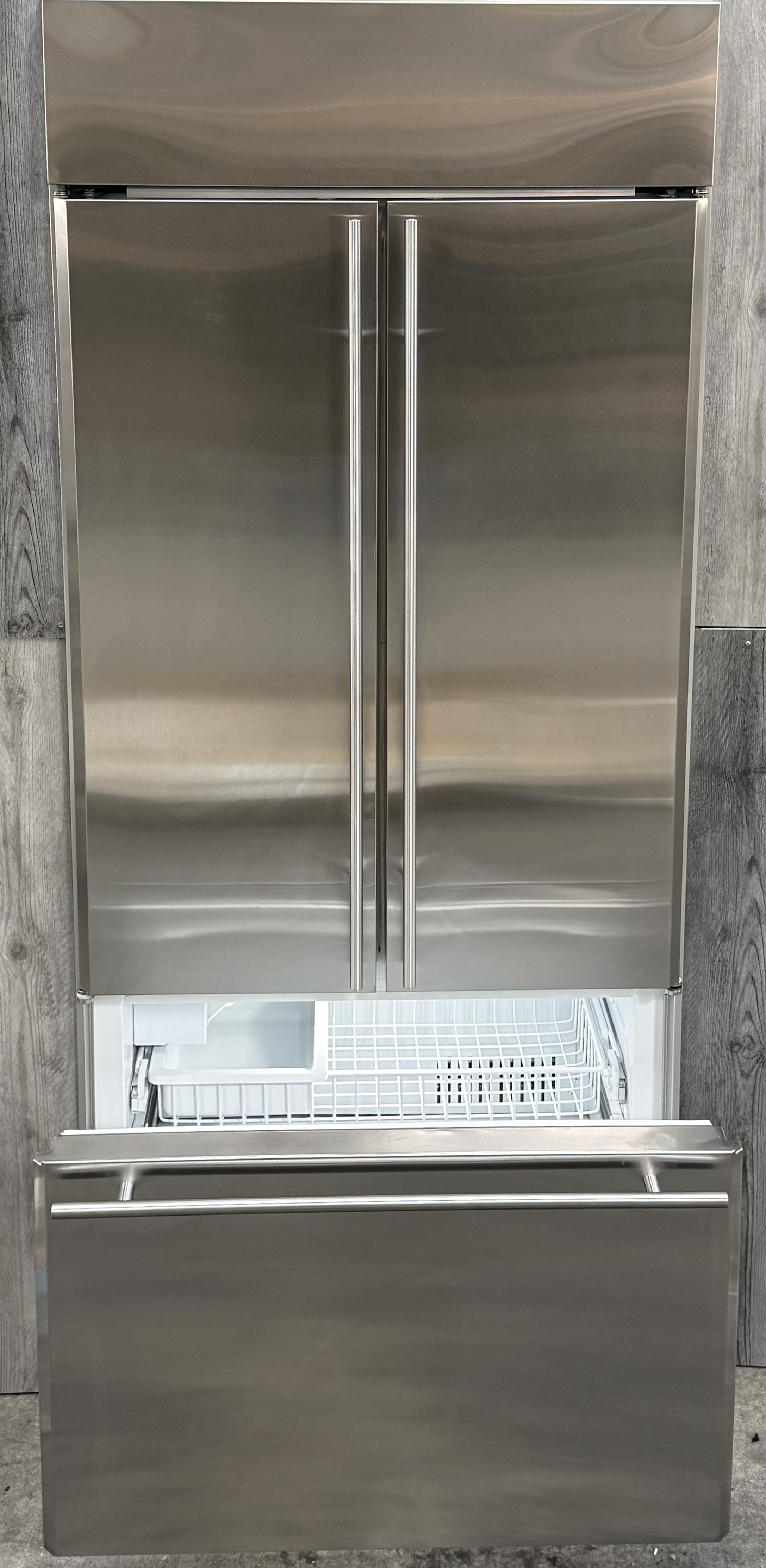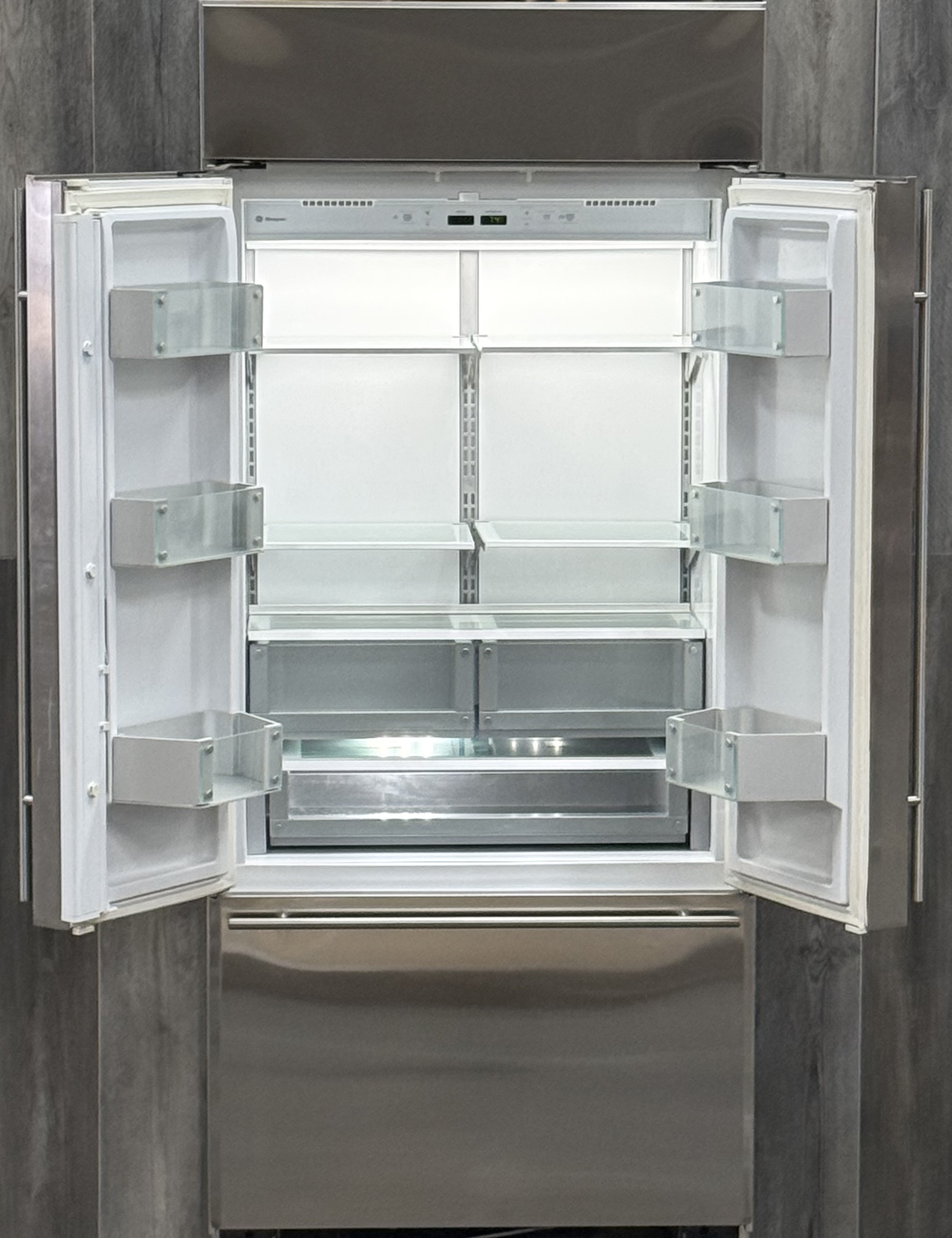 The sleek french door design of this built-in refrigerator gives you wide-open access to every fresh food shelf and bin. The entire fresh food section uses finely crafted glass with metal accents, all lit by bright LED lights to see all contents clearly. The full-extension freezer drawer has an automatic ice maker to keep plenty of filtered ice on hand. Control a myriad settings with the electronic controls, including precise temperature setting, all within easy reach.