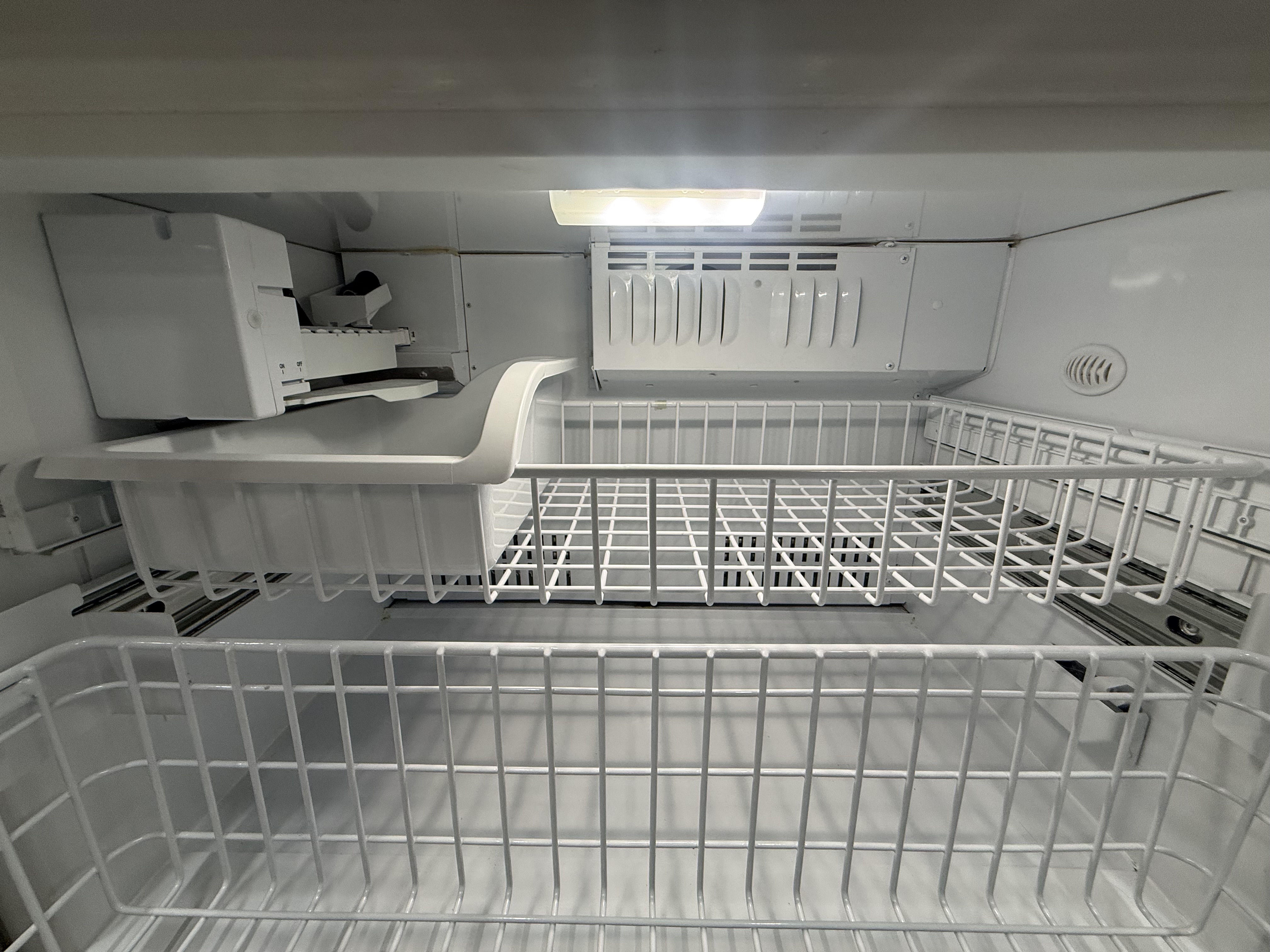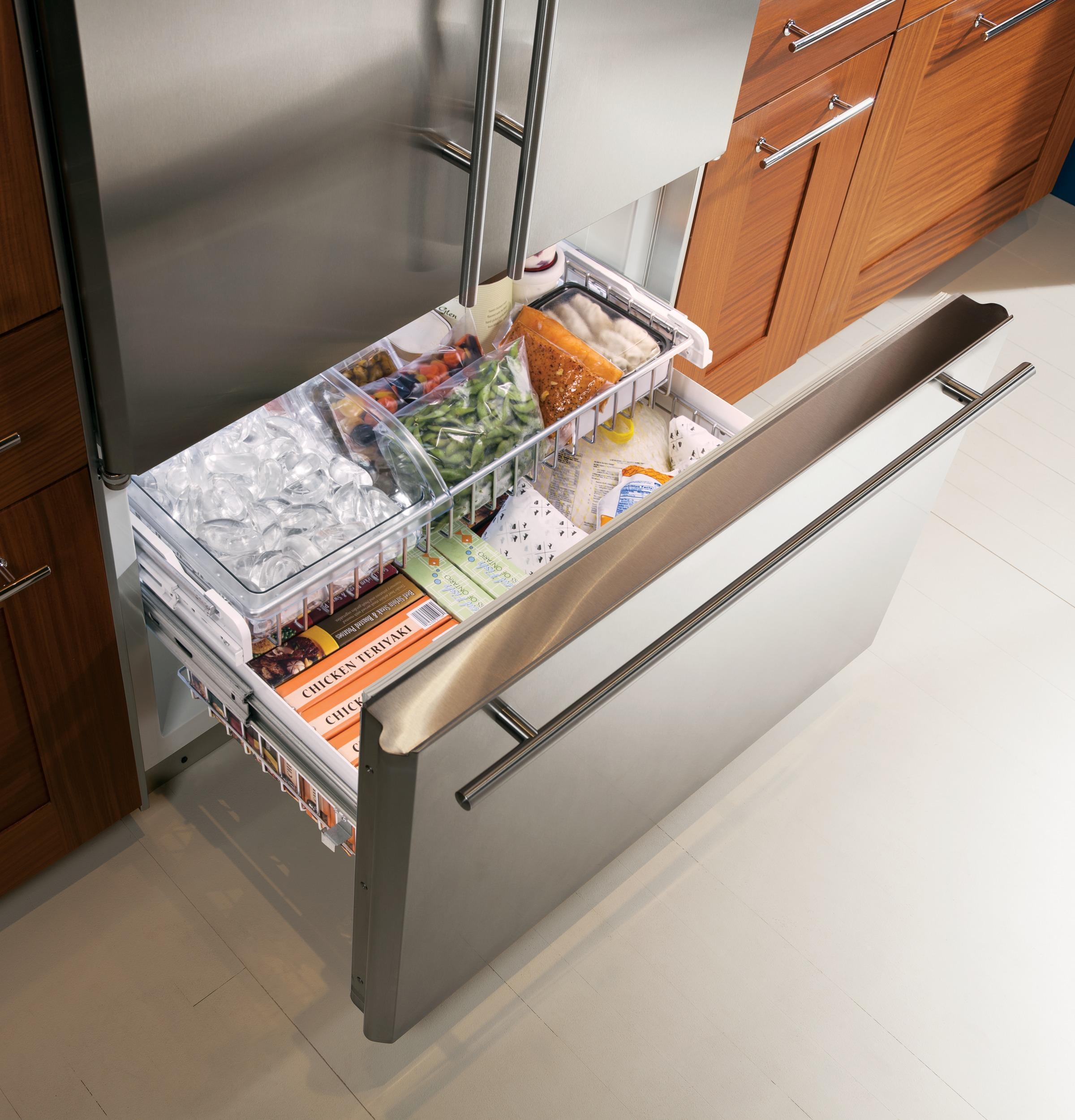 - LARGE FULL-EXTENSION FREEZER DRAWER: Has storage bins that slide out independently of one another for easy loading and unloading. An automatic icemaker keeps plenty of filtered ice on hand