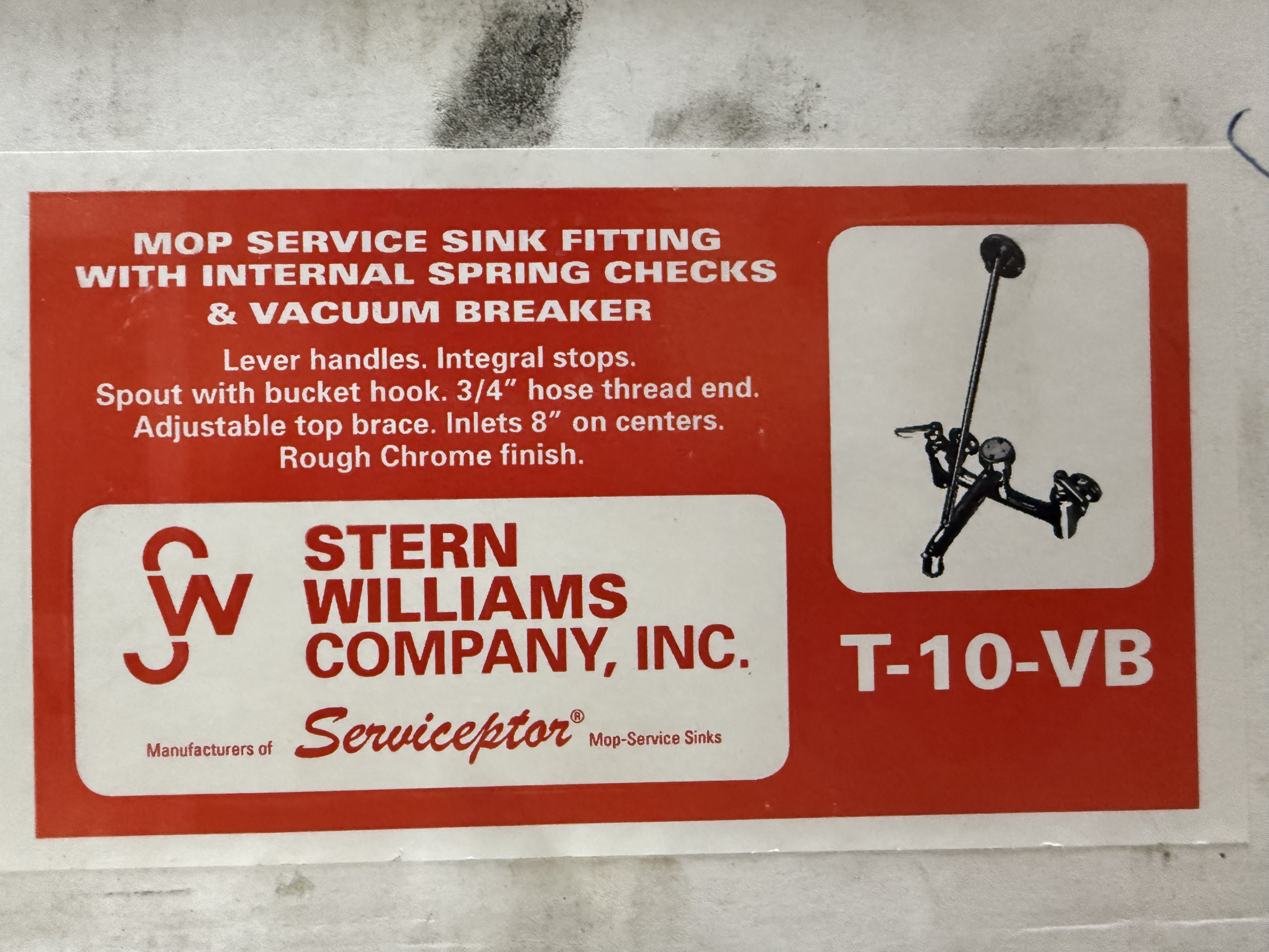 T-10-VB sink fitting with integral stops, lever handles and spring checks. Spout with bucket hook, 3/4 in hose thread end. Vacuum breaker, adjustable top brace. Inlets 8 in on centers. Chrome finish.