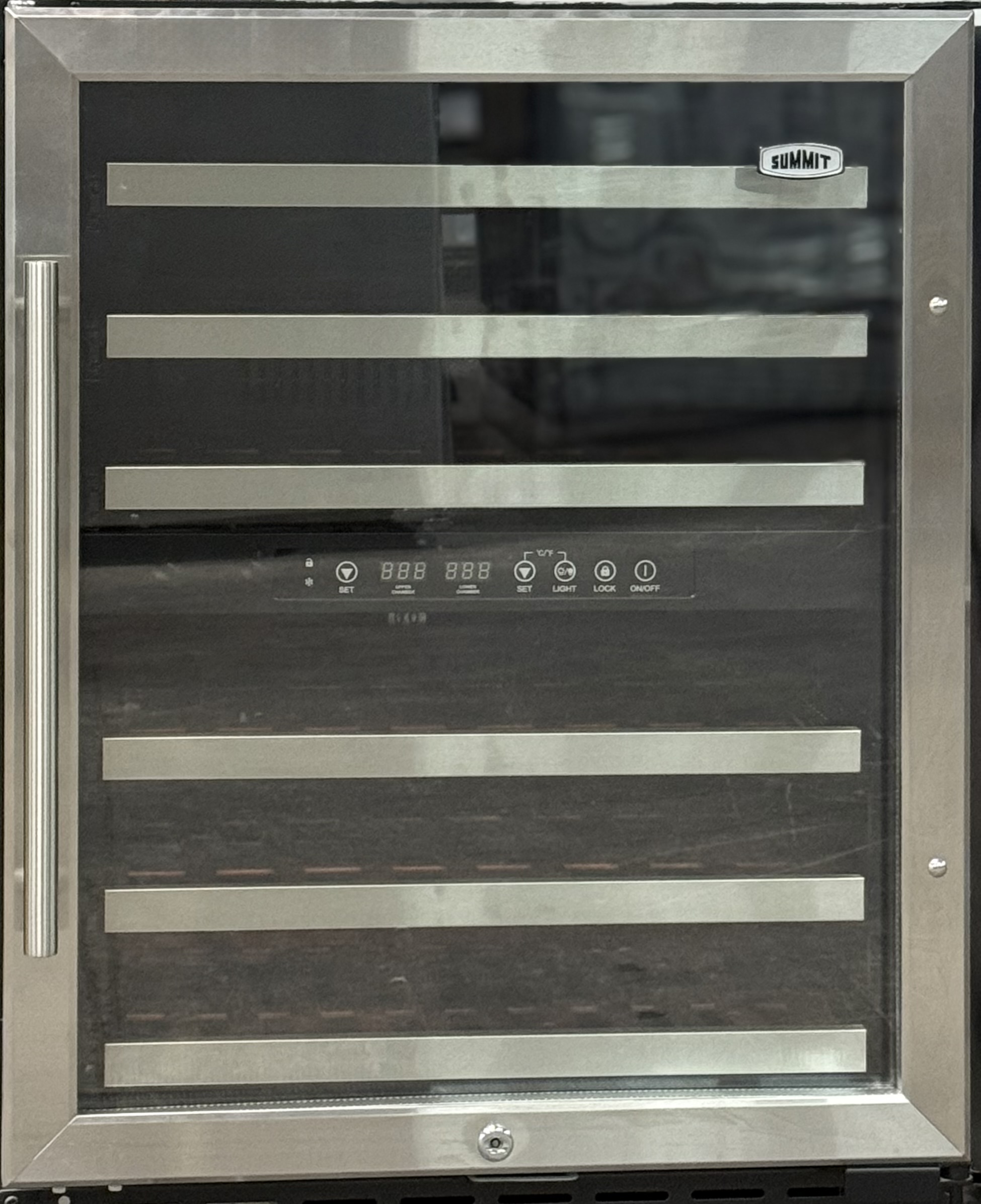Store your finest collection in the SWC530LBIST, an undercounter wine cellar with advanced features and stunning design. Two digital thermostats allow you to chill your white wine while separately preserving red at a warmer temperature. Slide-out wooden shelves with stainless steel trim let you store up to 46 standard 750ml sized Bordeaux bottles. Alternatively, you can store up to 40 bottles of the wider Pinot Noir or Chardonnay bottles, while still fitting an additional six Bordeaux bottles. Full automatic defrost, interior lighting, and SUMMIT’s own “hidden” evaporator help to keep use and maintenance simple. The SWC530LBIST’s exterior has a sleek black finish and reversible glass door to best display your collection. A professional stainless steel door handle completes the look. Fully front breathing with a flush back, this model can function as a freestanding or built-in unit in any home with a taste for modern luxury. Please note: the shelving and kickplate on your wine cellar might not match the pictured unit.