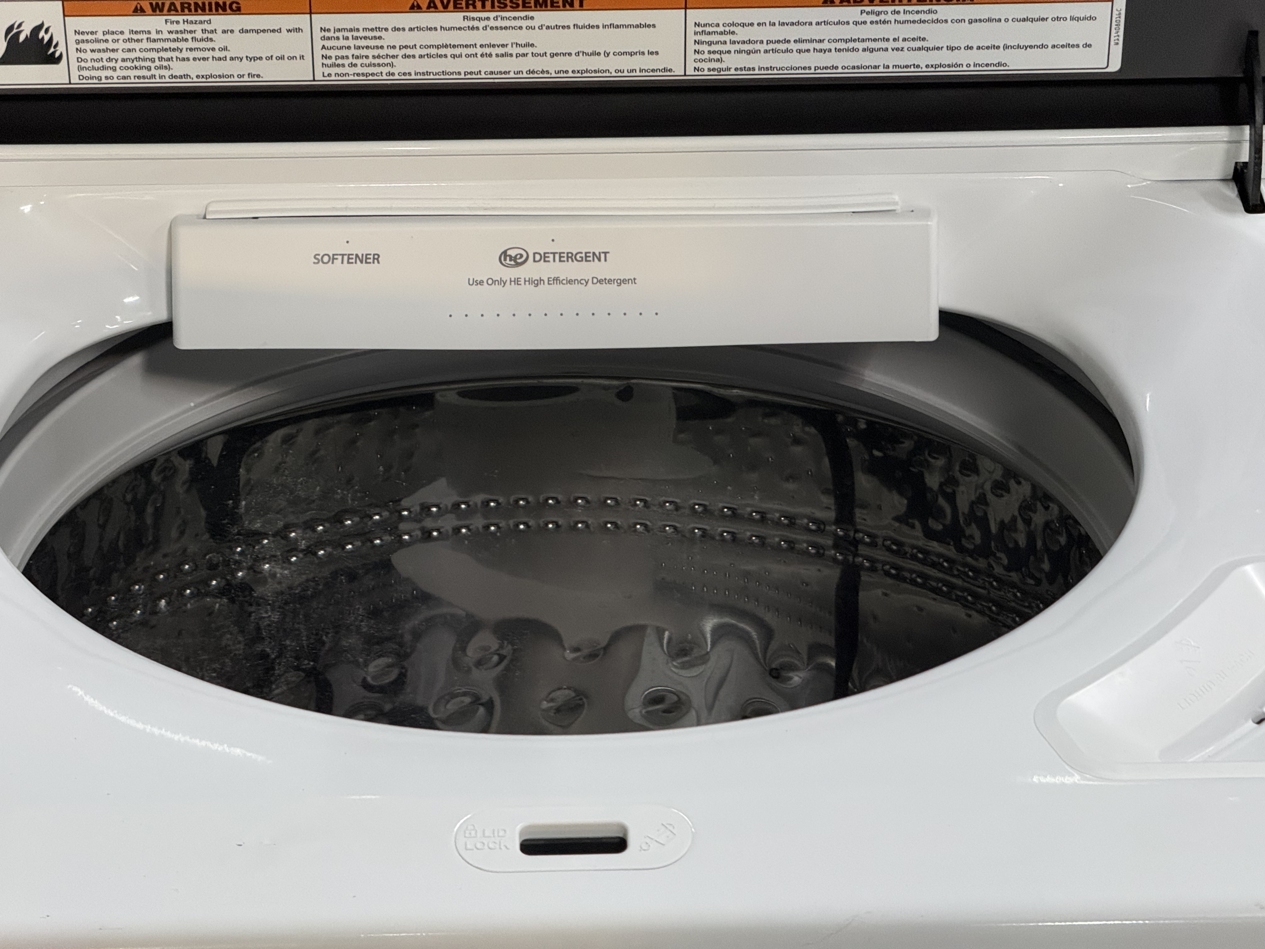 Unlock the lid any time simply by pressing the Start/Pause button. The lid automatically locks when the load sensing phase begins, at which point the Lid Lock icon on the console is illuminated.